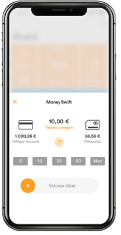 Use the MoneySwift function to transfer money from your VIMpay account to your NxtPay ( = VIMpayGo) in real time.