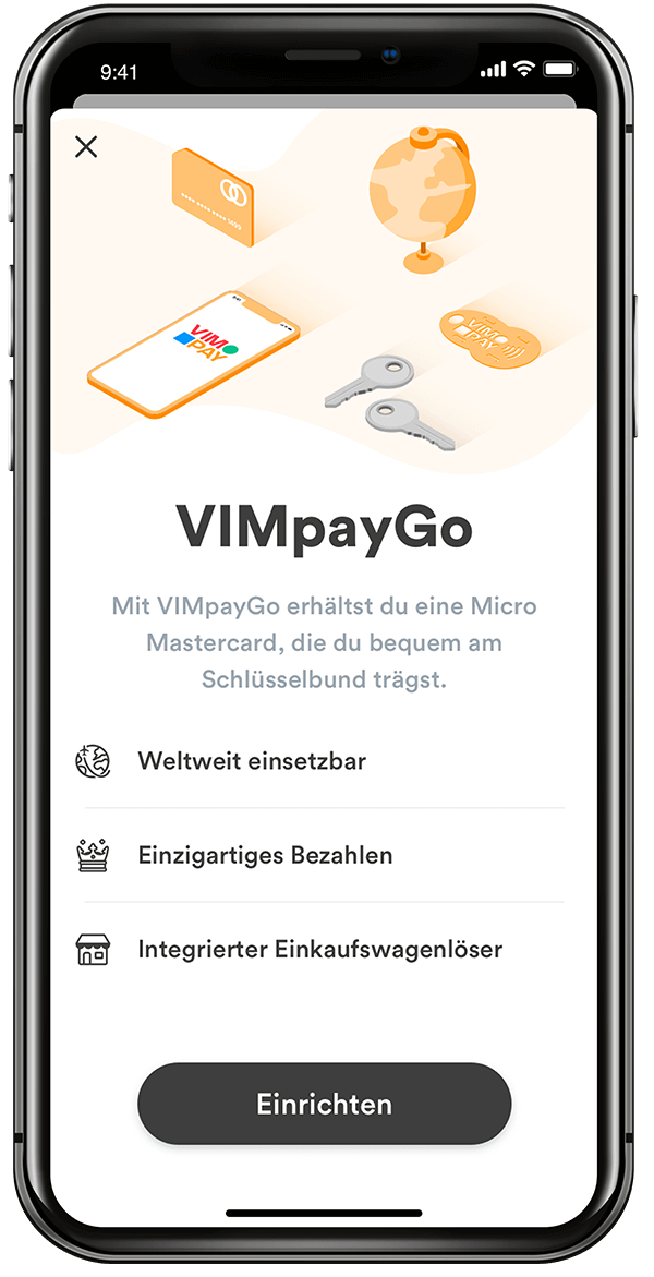 Add the VIMpayGo segment in the VIMpayBoard to set up your implant. To do this, click on (+) in the tab bar (Store), then scroll to the right to VIMpayGo in the ‘Payment’ list and click on ‘Set up’ at the bottom and finalise the corresponding setup steps.