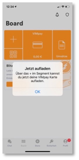 - Tap on the ‘+’ top-up icon in the orange VIMpay segment on the board