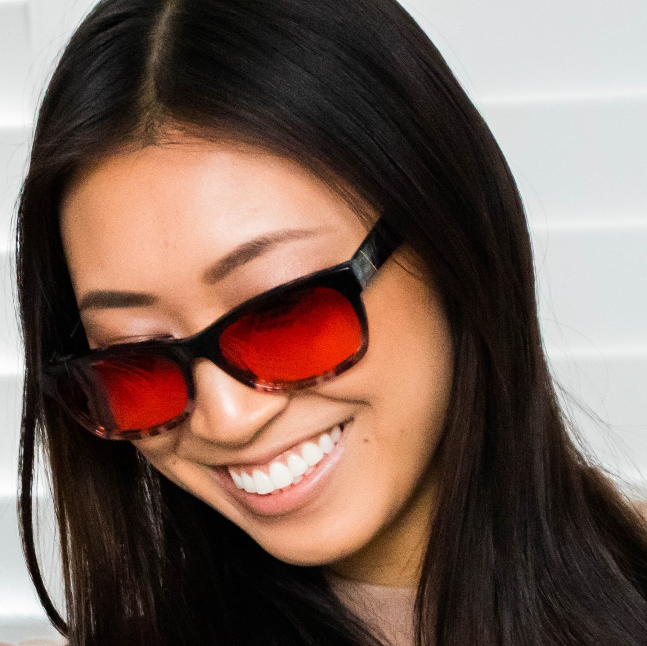The Twilight Sunset glasses block 99% of blue and 73%-95% of green light (i.e., all wavelengths under 590 nm). These colors have the strongest influence on melatonin production. The TrueDark lenses are made of scratch-resistant polycarbonate, are fully red-tinted, and also protect against UV light. Scratch resistance is an important quality feature, as low-quality glasses that scratch no longer function properly.