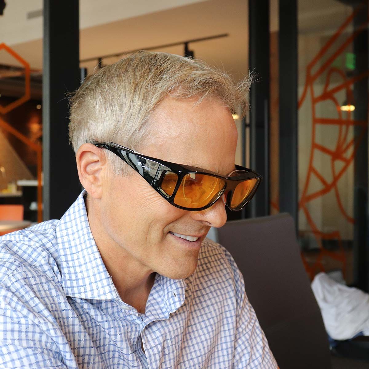 Wear the TrueDark Daywalker Fitover glasses during the day in places with strong artificial lighting or at the computer to avoid eye fatigue.
