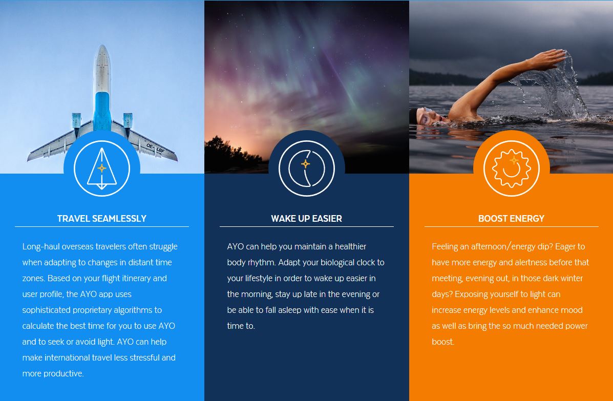 Long-distance travelers often struggle with adjusting to distant time zones. Based on your flight plan and user profile, the AYO App uses sophisticated proprietary algorithms to calculate the best time to seek or avoid light. AYO makes international travel less stressful and more productive. - Wake up better:
