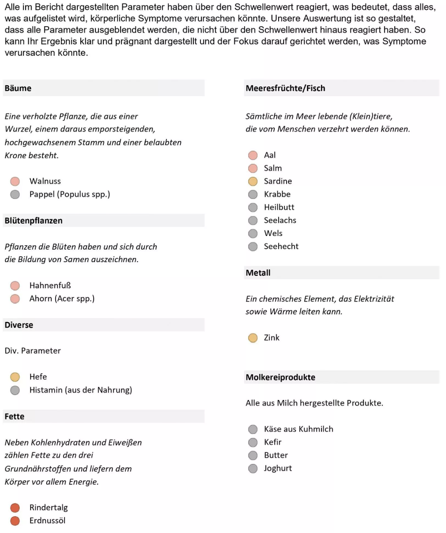 The Intolerance Analysis examines up to 900 potential substances – including foods, additives, plants, animal hair, metals, and more. This reveals which substances your body reacts to and which are well tolerated.