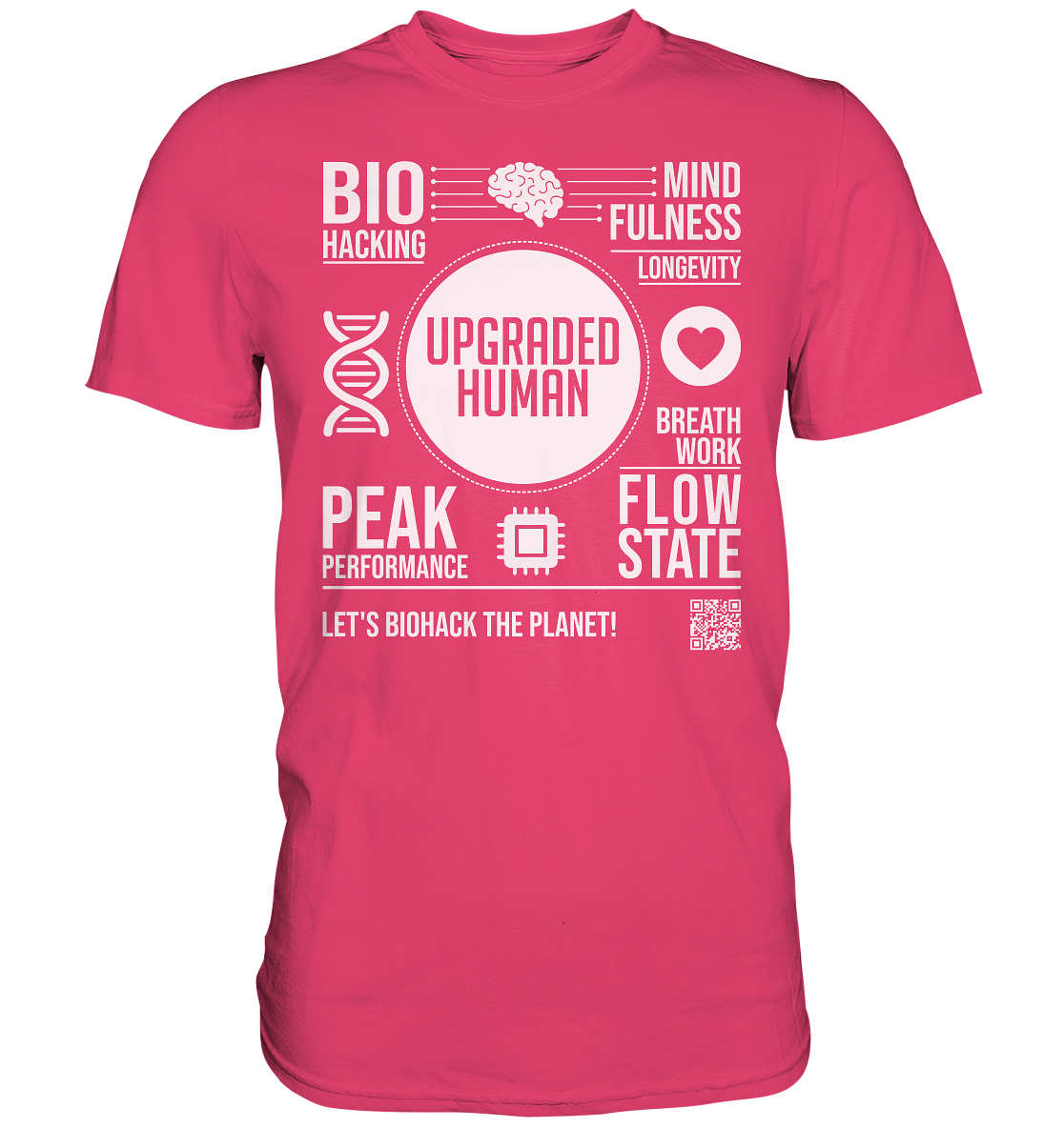 - Eye-catching front print with biohacking keywords & QR code
