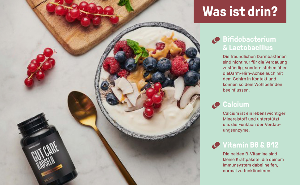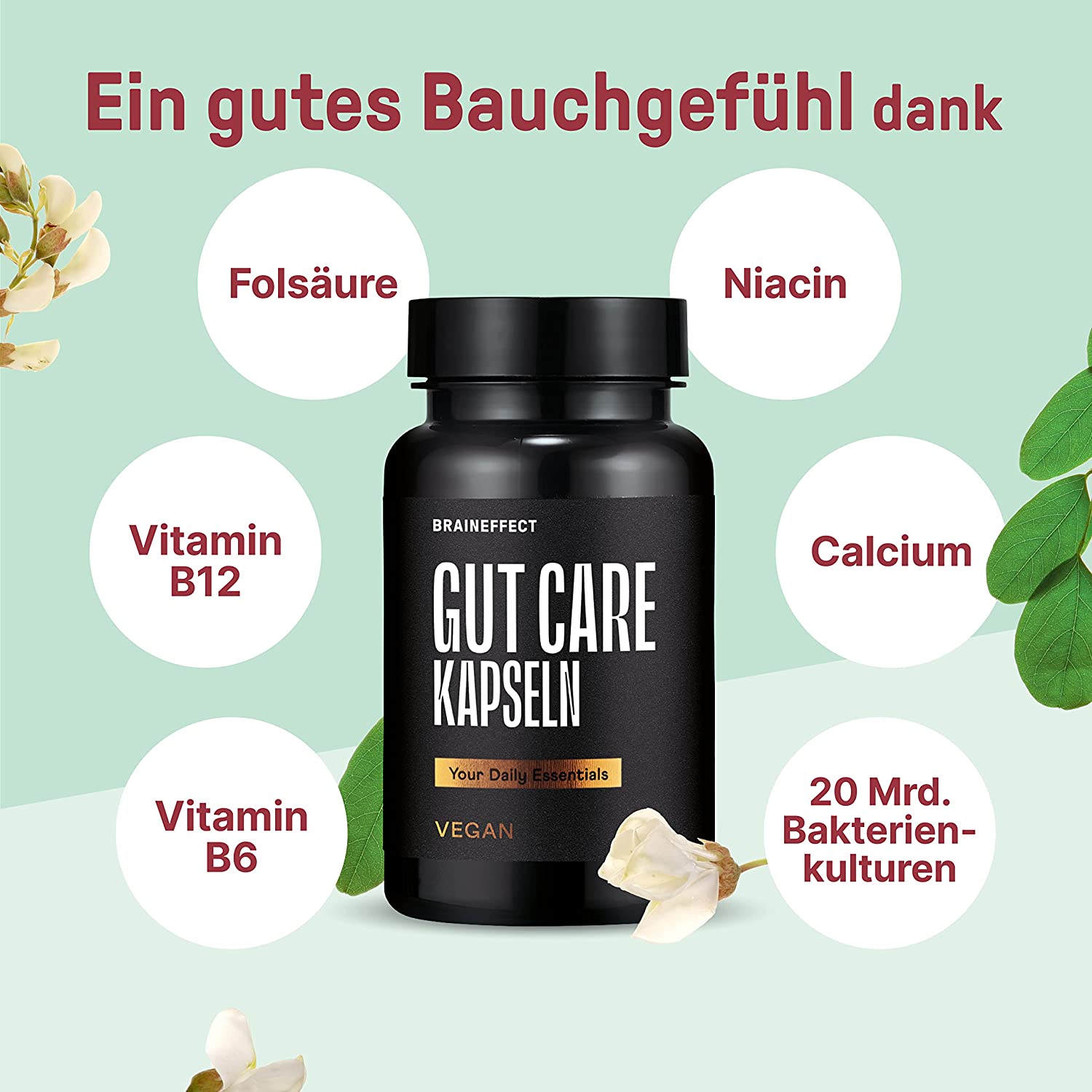 GUT CARE capsules contain: Calcium carbonate, acacia fiber powder (Acacia seyal), dextrin (Nutriose), coating: hydroxypropyl methylcellulose (vegetable capsule shell), Lactobacillus crispatus, nicotinamide, Lactobacillus plantarum, Lactobacillus acidophilus, Lactobacillus rhamnosus, Bifidobacterium longum, Bifidobacterium breve, Bifidobacterium bifidum, Bifidobacterium lactis, Lactobacillus casei, Bifidobacterium infantis, Streptococcus thermophilus, Lactobacillus helveticus, Lactococcus lactis, Lactobacillus gasseri, Bifidobacterium adolescentis, Lactobacillus paracasei, Bacillus coagulans, Enterococcus faecium, Lactobacillus reuteri, Lactobacillus salivarius, vitamin B6, folic acid, vitamin B12