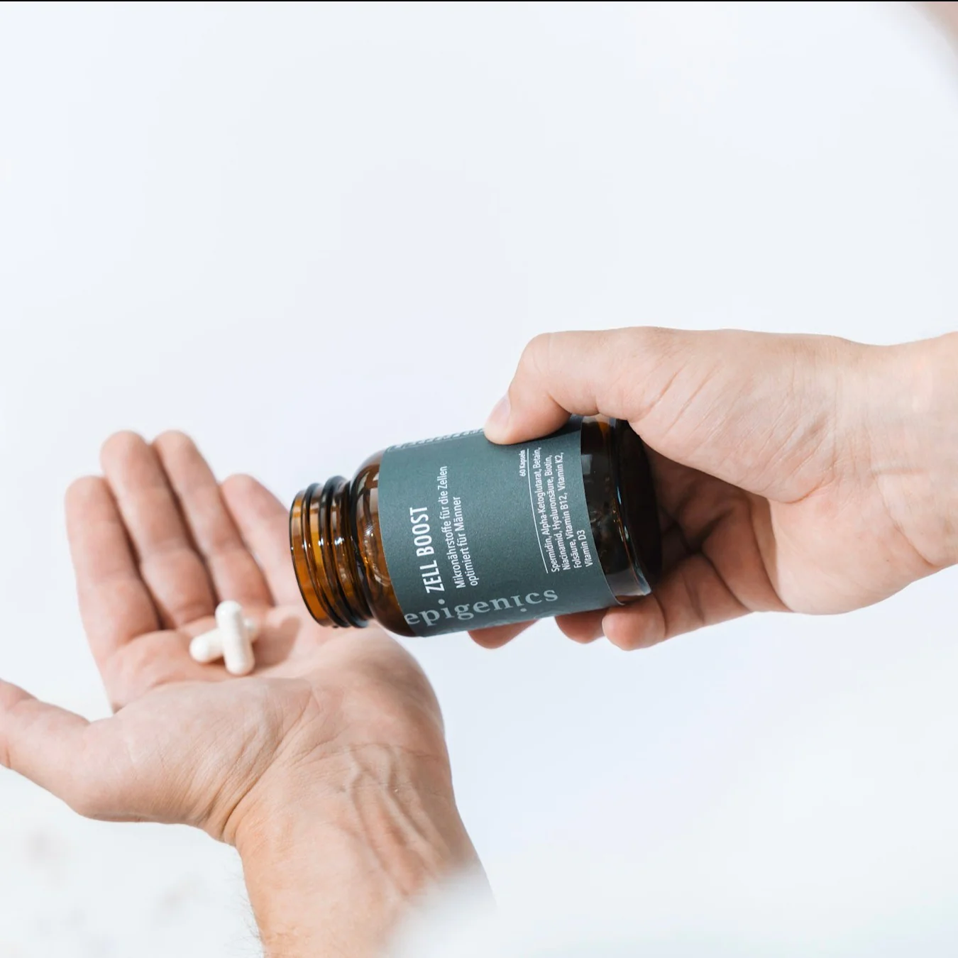 Zellboost M is a premium dietary supplement that supports healthy cell aging. The synergistic formula combines scientifically researched ingredients such as Spermidine, Alpha-Ketoglutarate (AKG), Niacinamide, and Trimethylglycine (TMG). These substances act at the cellular level and promote regeneration, energy production, and protection against age-related damage.