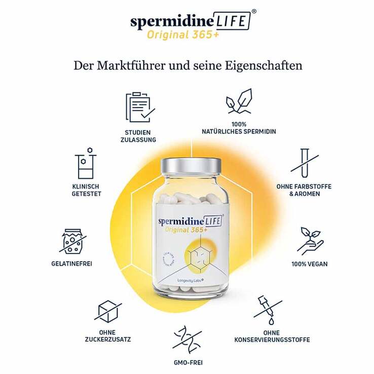 Based on over ten years of research in collaboration with internationally recognized cell researchers, we developed spermidineLIFE® Original 365+, which is the world’s first dietary supplement with a high spermidine content. In cooperation with international clinics and universities, it has been positively tested for safety and tolerability.2