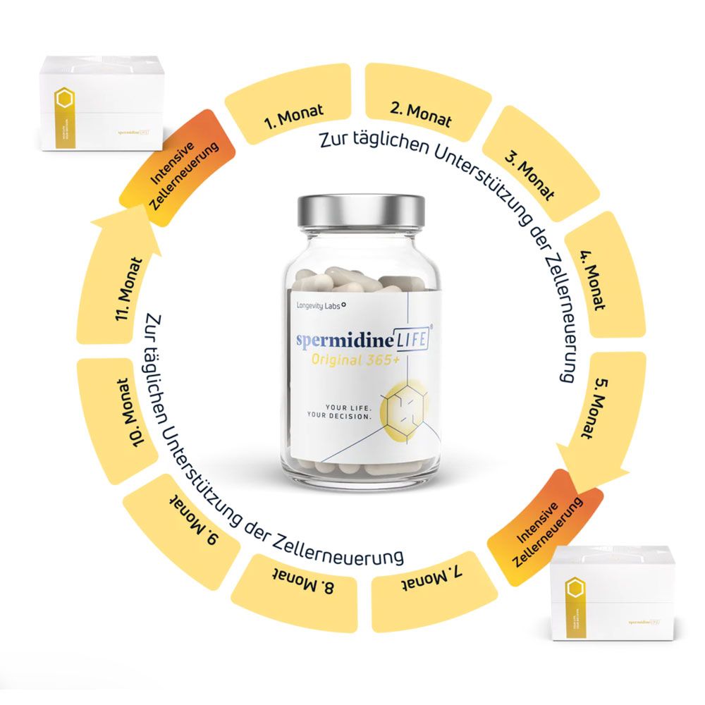Internal long-term studies and trials have shown that the spermidineLIFE® products, especially with regular and long-term use, show their full potential for positive effects. However, you can further enhance these effects by giving your cell renewal an extra boost twice a year, followed by another phase of lower spermidine intake.