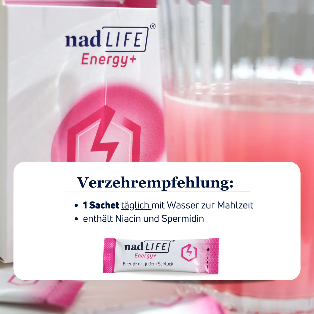 nadLIFE Energy+ is a world first because it combines niacin in the form of NAM and spermidine for the first time. It provides you with energy AND supports the renewal of the power plants in your cells. nadLIFE Energy+ combines the latest technology with the highest quality and was carefully developed to meet your needs.