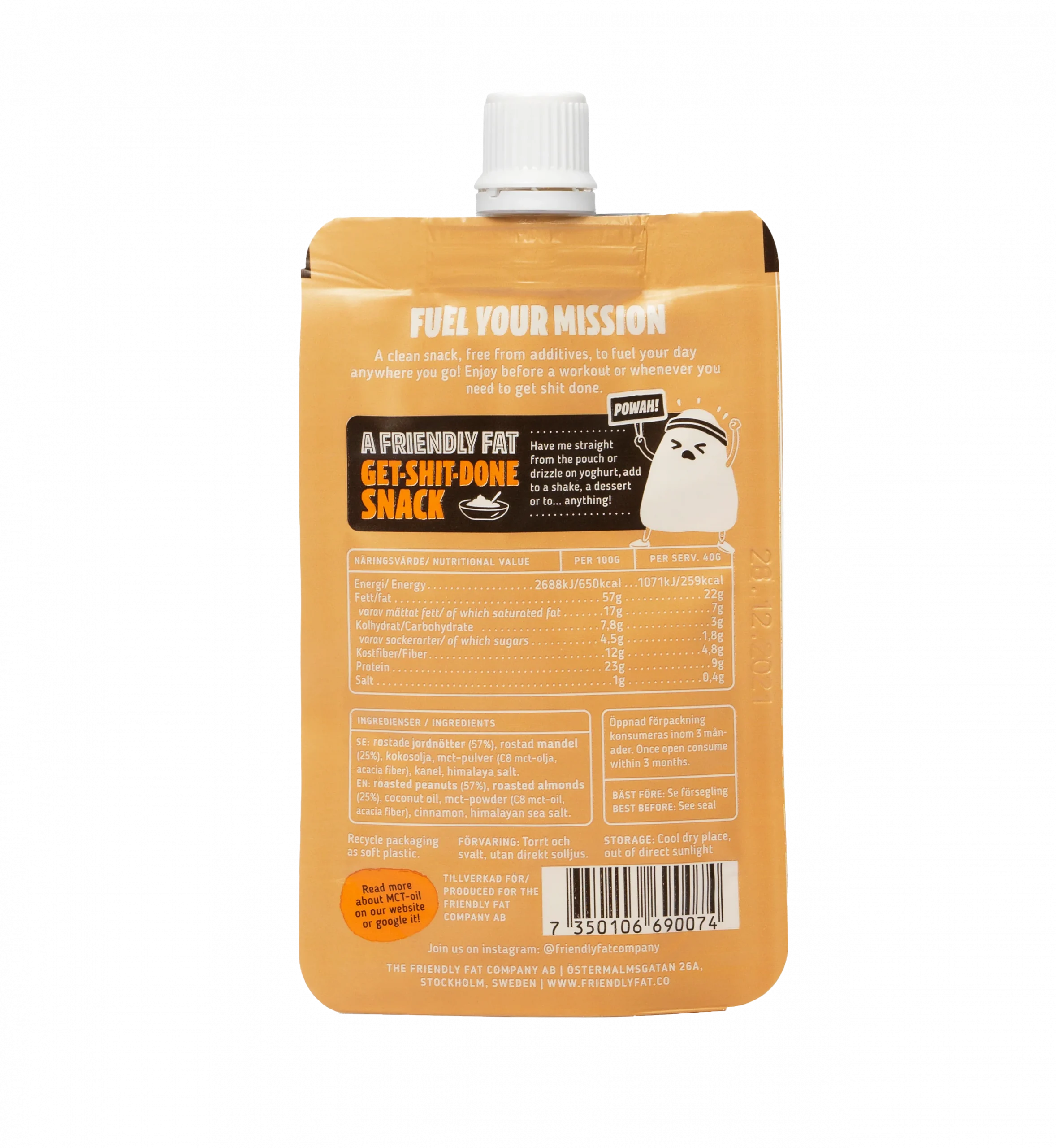 The nut butter from The Friendly Fat Company is a natural and nutritious snack – packaged in a convenient pouch with a resealable cap for on-the-go.