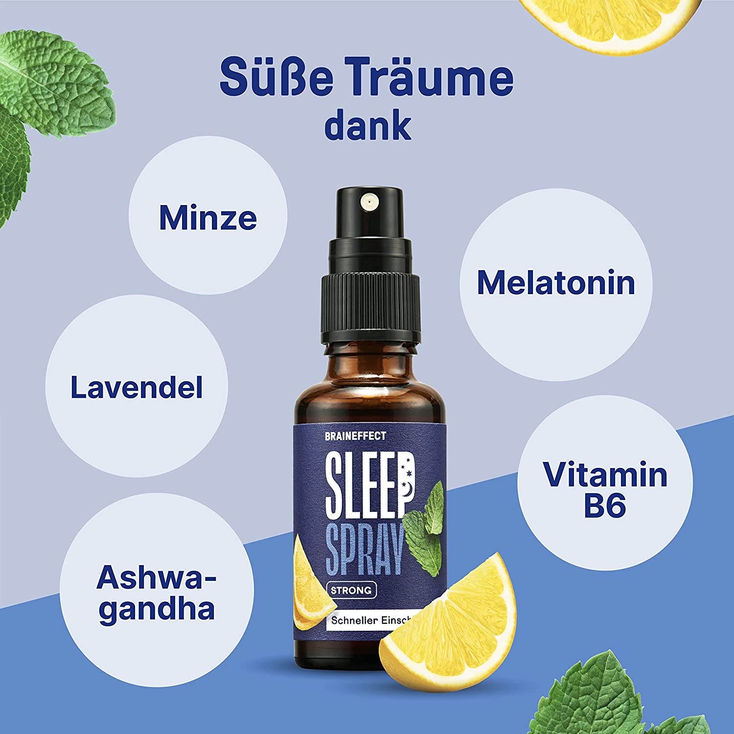 Spray 4 times into the mouth 20 minutes before bedtime. Shake before use. One spray contains 0.5 mg of melatonin. SLEEP SPRAY STRONG contains no sugar or alcohol and has a fresh taste, so it can be used even after brushing your teeth.